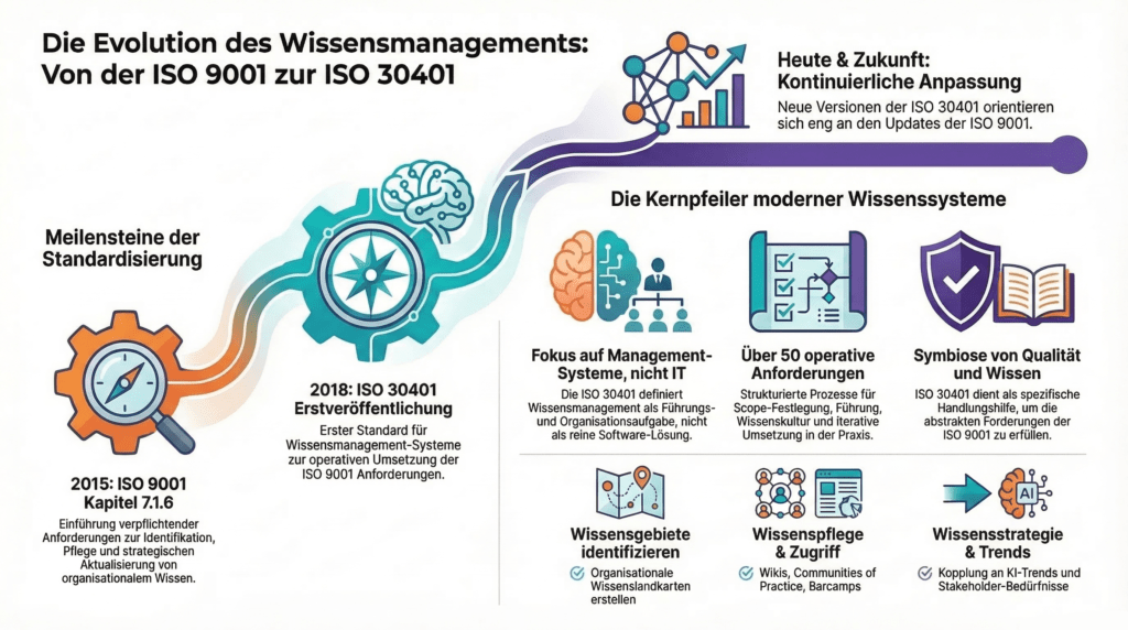 Im Jahr 2018 erschien dann die erste Version der ISO 30401 „Knowledge Management Systems – Requirements“. Wichtig dabei ist, dass mit „Systems“ Management-Systeme und nicht IT-Systeme gemeint sind, das wird in der Praxis oft verwechselt. Die ISO 30401 versteht sich als Handlungshilfe, die drei Anforderungen aus der ISO 9001 operativ mit Leben zu füllen: